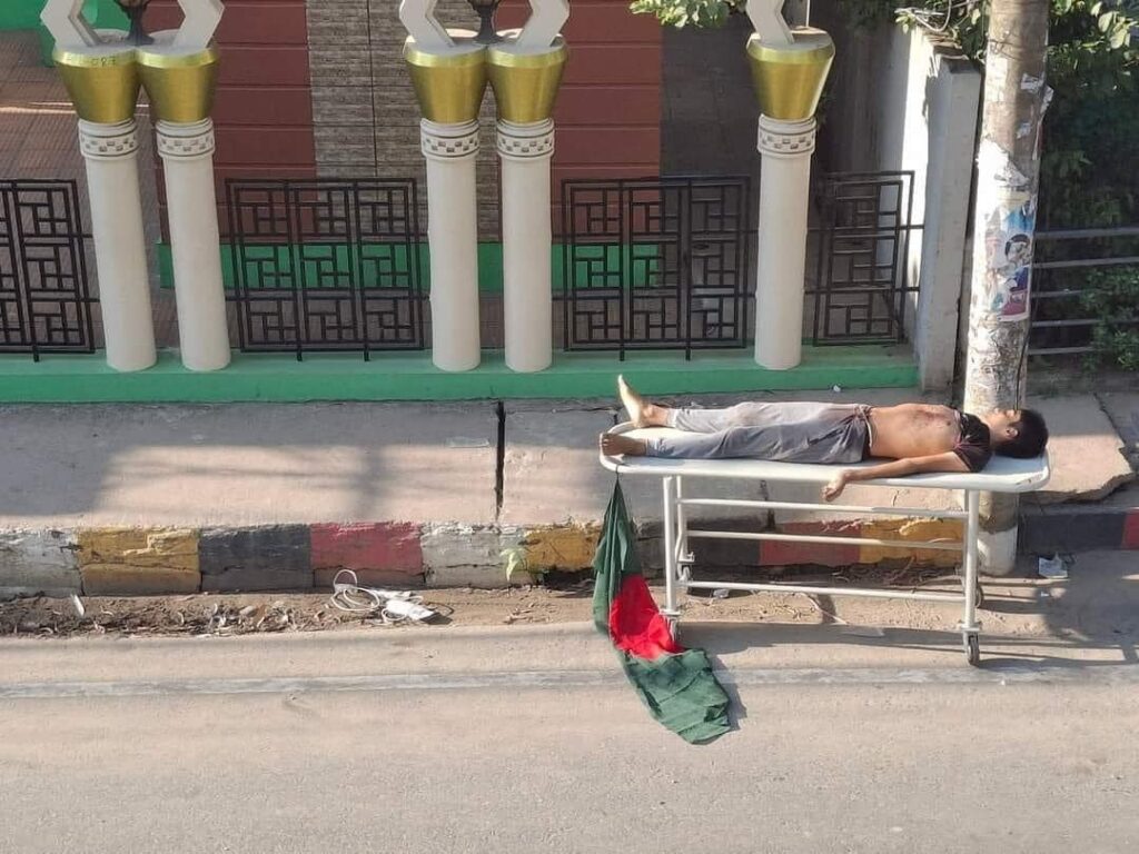 Ninth grader Tahmid Bhuiyan Tamim (15). After the police shot him dead, the protesters kept his body on a stretcher and chanted slogans. Police opened fire on the procession with the dead body forcing them to leave the dead body on the street. Tahmid’s father reported seeing the dead body getting shot, again.